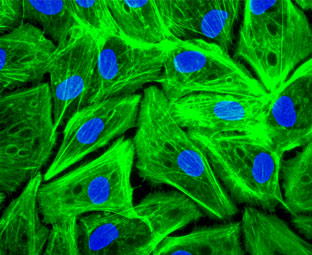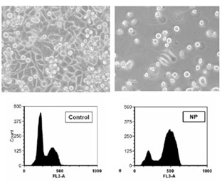 Effect of NP son cell viability and distribution in the cell cycle. Elisa plate. Phalloidin and DAPI staining of human pigmented epithelial cells (ARPE cells).