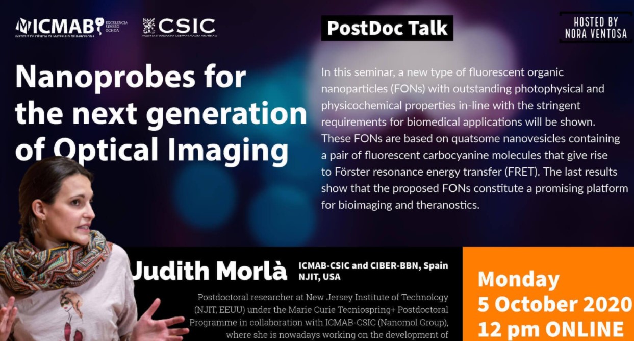 Judit Morlà Folch, CIBER-BBN Researcher in Nanomol Group and NANBIOSIS U6 Biomaterial Processing and Nanostructuring Unit at ICMAB-CSIC is giving the seminar “Nanoprobes for the next generation of Optical Imaging“, today Monday, 5 October 2020 at 12 pm, Hosted by Nora Ventosa, Nanomol Group in the cycle of Online ICMAB PostDoc Talk.