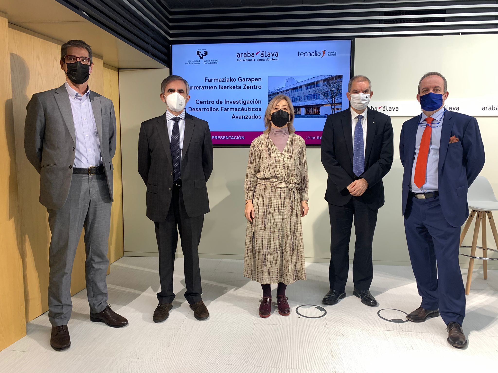 In the picture: Jose Luis Elejalde from Tecnalia, Javier Hernando from the Provincial Council of Alava, Pilar Garcia de Salazar, Lieutenant General Deputy and Provincial Deputy for Economic Development and Territorial Balance in the Provincial Council of Alava. Jose Luis Martin, Vice-Rector for Research of the UPV / EHU and Jose Luis Pedraz, IP NanoBioCel group.
