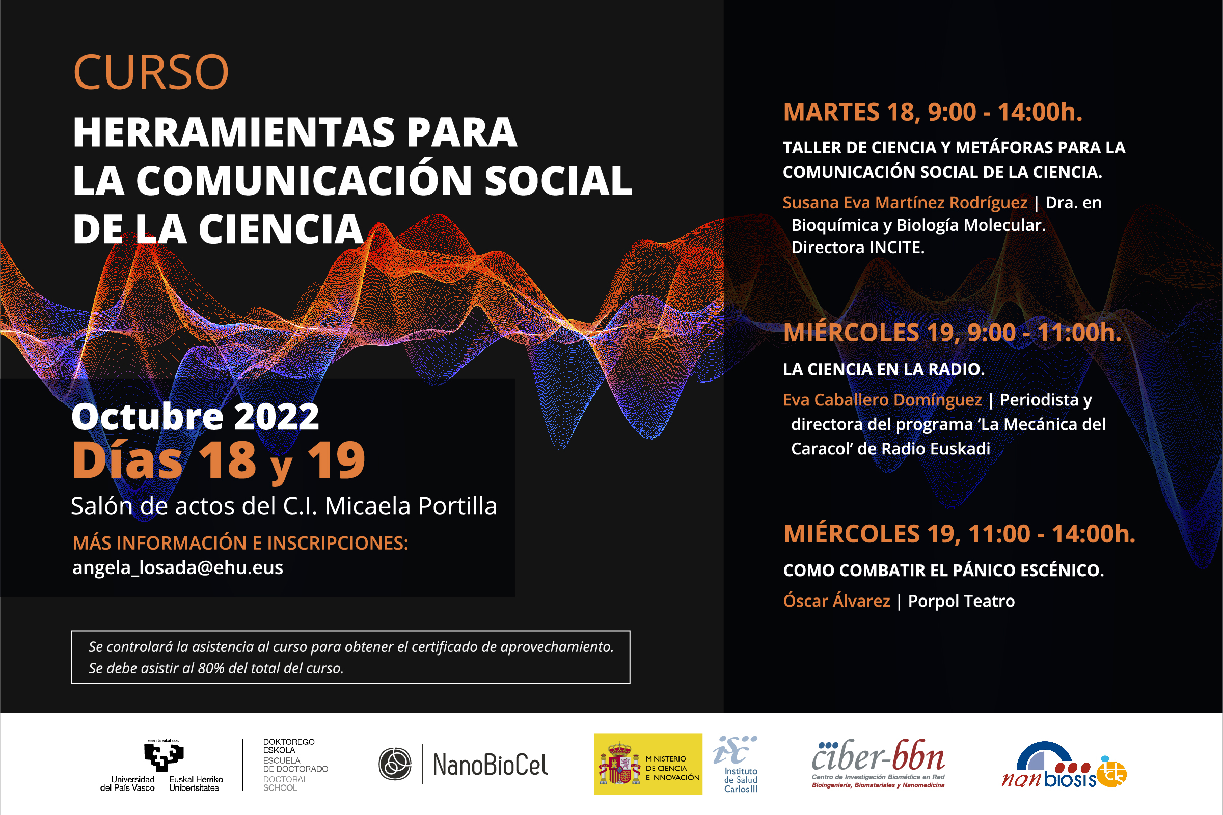 On October 18 and 19, was held the second course on Social Communication of Science, orgnized by NANBIOSIS U10 Drug Formulation Unit -(NanoBioCell Group of CIBER-BBN and UPV-EHU, this year entitled “Tools for the social communication of science“. The course aimed to provide doctoral students with communication with tools to be employed in their work as scientists when communicating their results or activity to the general public, patients, etc.